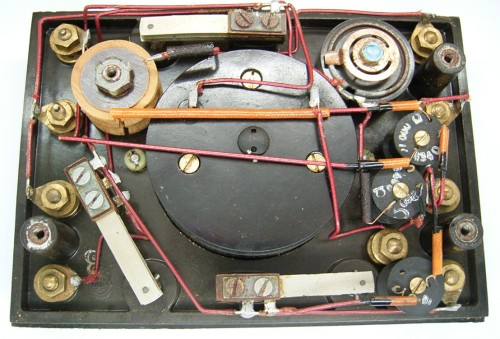 Auch das Innenleben ist interessant. Alle Messwiderstände sind aus Widerstandsdraht gewickelt, teilweise auf einen gedrehten Holz-Spulenkörper. Die Schaltkontakte erinnern an alte Telefontechnik. Das Drehspul-Messwerk hat eine Empfindlichkeit von 2 mA und einen Innenwiderstand von 100 Ohm.