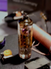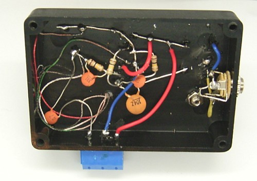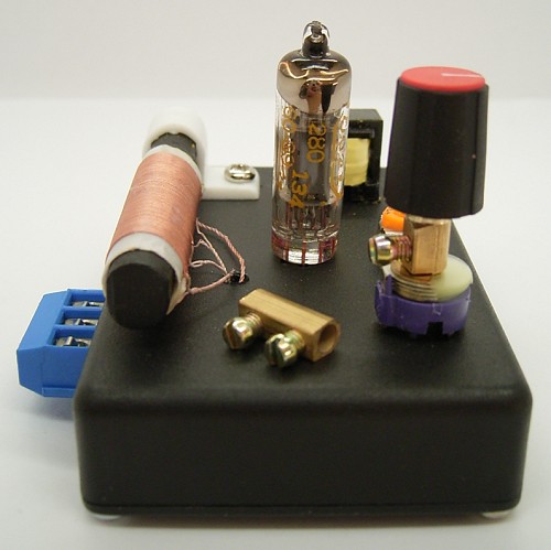 Alles sollte möglichst klein sein. Der Drehko ist deshalb ein 105-pF-Trimmer, die Spule stammt aus einem AM/FM-Radio von Kosmos und erreicht trotz der geringen Kapazität das untere Ende des Mittelwellenbereichs. Der Übertrager kommt aus einem kleinen Hochspannungsgenerator zur Ionenerzeugung, vermutlich kann auch ein Wandlertrafo aus einem Blitzgerät genommen werden. Die Röhre selbst braucht nur acht kleine Löcher im Kunstsoffgehäuse. Die Drähte werden dann leicht umgebogen und frei verdrahtet.