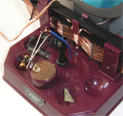 Der Kristall liegt in einer kleinen Messingwanne und wird durch eine verstellbare Stahlfeder berührt. Mit vorsichtigem Probieren findet man eine aktive Stelle. Es hat sich bewährt, zuerst die Germaniumdiode einzusetzen und den Schwingkreis auf einen gewünschten Sender abzustimmen. Mit einem natürlichen Kristall wird das Radio dann etwas leiser und schwieriger einzustellen.
