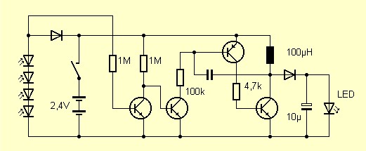 Hier die Schaltung: Rechts erkennt man einen Oszillator mit Drossel ähnlich wie beim LED-Spannungswandler. Leider ist die Kapazität des SMD-Rückkopplungskondensators nicht erkennbar. Links im Schaltbild sieht man die Abschaltautomatik: Wenn die Spannung an der Solarzelle noch zu hoch ist, wird der Oszillator gesperrt. Dabei braucht die Schaltung dann nur noch ein Strom von unter 5 µA. Allerdings war die Schottky-Ladediode in Sperrrichtung nicht dicht genug. Auch im Dunkeln lag noch über 1 V an der Fotozelle und der Oszillator damit abgeschaltet.