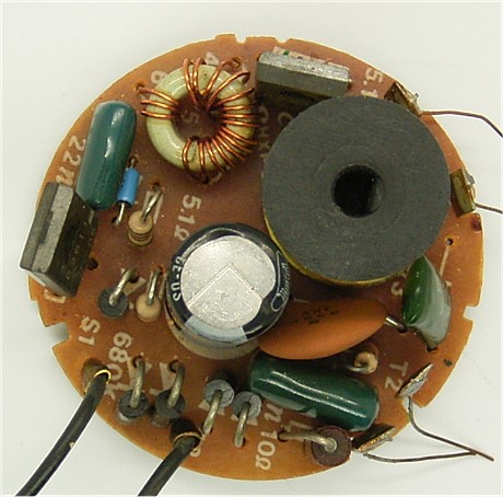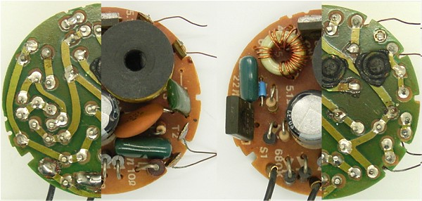 Wie dem auch sei, die Lampe enthält viele wertvolle Bauteile. Das beste ist der Elko mit 4,7 µF, 350 V, der zum Beispiel für einen Röhrenverstärker zu gebrauchen ist. Näheres über die anderen Bauteile verrät vielleicht ein kompletter Schaltplan. Ich habe mir immer schon mal vorgenommen, eine solche Schaltung abzuzeichnen. Es ist relativ kniffelig. Deshalb versuche ich es mit einer Fotomontage aus Unterseite und Oberseite der Platine.