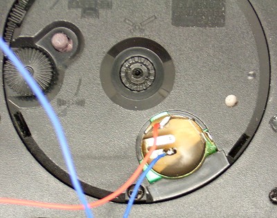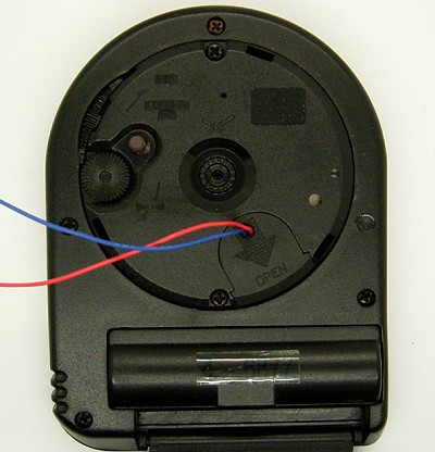 Also gut, die Batterie der Uhr wird entfernt. Statt dessen werden zwei Drähte an gelötet. Der blaue Draht liegt am Minuspol, der rote am Pluspol. Die serielle Schnittselle liefert an der Datenleitung TXD am Pin 3 des 9-poligen Steckers im Ruhezustand -10V. DerMasseanschluss GND liegt am Pin 5. Jetzt muss man nur noch dafür sorgen, dass die Uhr die gewohnte Spannung von ca. 1,5 V bekommt. Drei Si-Dioden, ein Widerstand und ein Elko reichen aus, um die Betriebsspannung auf etwa 1,4 V zu stabilisieren. Die Durchlassspannung einer Si-Diode liegt nämlich bei ca.0,7 V.