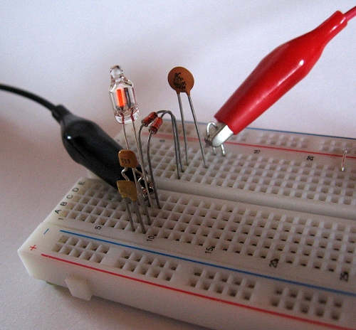 Ich habe die Schaltung auf einer Steckplatine nachgebaut. Die Glimmlampe habe ich von