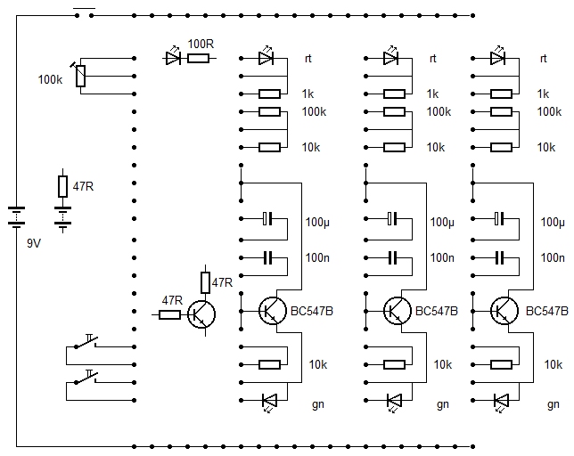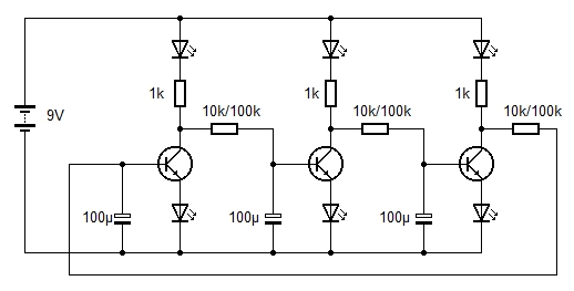 ähnliche Schaltung habe ich schon mal für das Conrad-Osterei verwendet oder auch im analogen Lauflicht mit neun LEDs. Hier kann man zwischen zwei Geschwindigkeiten wählen, indem man je nach Wunsch 100 k oder 10 k anschließt.
