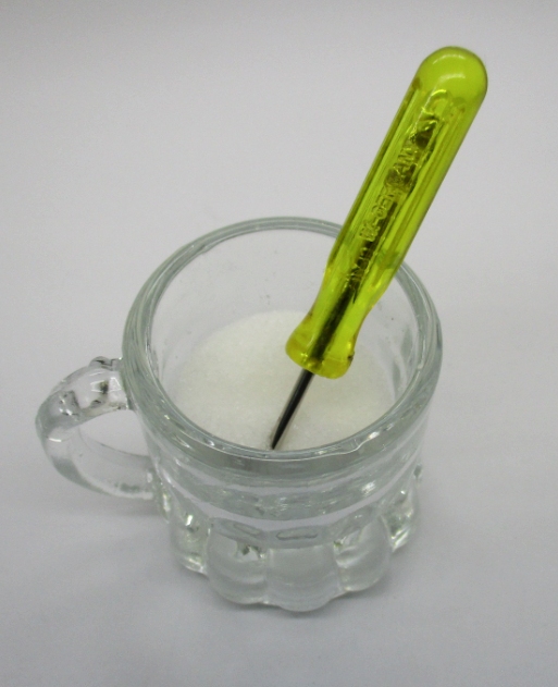 eines Schraubendrehers von innen gegen die Wand eines Glases drücken.