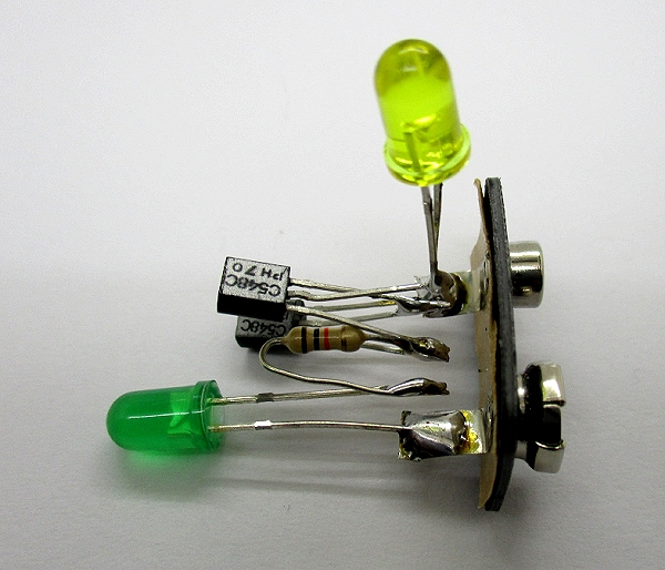 Die Bauteile wurden direkt auf einen Batterieclip gelötet, der aus