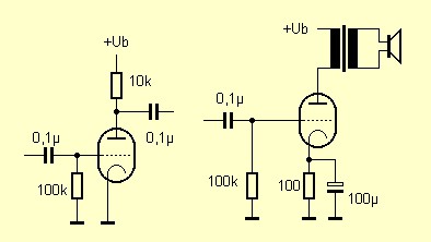 Wie baut man mit Röhren Verstärker? Fast genau so wie mit Transistoren. Die Kathode entspricht dem Emitter, die Anode dem Kollektor. So wie über die Basis des Transistors der Kollektorstrom gesteuert wird, steuert die Gitterspannung den Anodenstrom der Röhre. Die Niedervolt-Röhre ECC86 enthält zwei Trioden mit getrennten Kathoden, Gittern und Anoden.