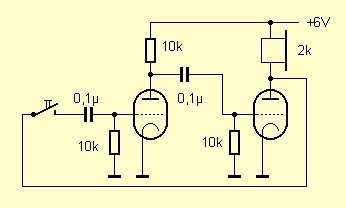 Zweistufige Verstärker sind auch ganz einfach. Man hat ja in der ECC86 gleich zwei Trioden. Die Stufen koppelt man über Kondensatoren. Jede Stufe kehrt die Phase um, wie es auch bei der Emitterschaltung ist. Deshalb kann ein zweistufiger Verstärker durch eine Rückkopplung einen Oszillator bilden. Eine Morsetaste wird angeschlossen, fertig ist das Morse-Übungsgerät. Der Ton erschallt aus einem Kopfhörer mit einem Innenwiderstand von 2 Kiloohm.