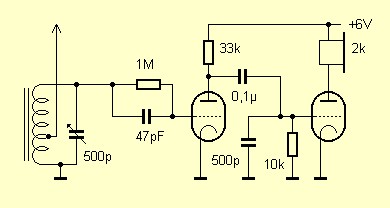 Die Schaltung entspricht fast einem zweistufigen Verstärker. Die erste Stufe dient der Demodulation und der Vorverstärkung. Die zweite Stufe ist der NF-Ausgangsverstärker und steuert direkt einen Ohrhörer mit eine Impedanz von 2 Kiloohm. Zwischen den Stufen sorgt ein Kondensator mit 500 pF dafür, dass keine HF-Signale weiter verstärkt werden. Sonst besinnt sich die Röhre leicht auf ihren ursprünglichen Zweck und erzeugt Eigenschwingungen im UKW-Bereich.