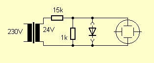 Damit die Sache nicht zu schwierig wird, wurde eine Testschaltung gebaut, um die Gleichrichterwirkung gut erkennen zu können. Die Wechselspannung eines Trafos mit 24 V wurde mit einem Spannungsteiler verringert. Die Diode im Test verändert die Kurvenform.