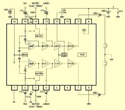 Nach längerer Suche im Internet wurde das Datenblatt der japanischen Firma Rohm gefunden. Der BH3540AFS ist ein Kopfhörerverstärker für CD-Laufwerke mit internem Tiefpassfilter und Verstärkungs-Einstellung über eine Gleichspannung. Außerdem gibt es Mute-Eingänge, mit denen man das Einschaltknacken verhindern kann. Die Verstärkung beträgt nur ca. -3dB. Der Regelumfang ist aber 80 dB. Die Ruhestrom beträgt etwa 10 mA. Das Datenblatt enthält auch eine typische Anwenderschaltung: