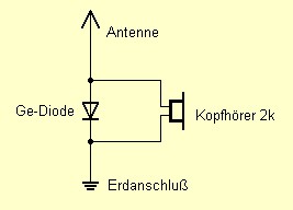 Der einfachste Empfänger besteht nur aus einer langen Antenne, einem Erdanschluß, einer Germanium-Diode und einem Kopfhörer. Die Stromversorgung erfolgt durch die Antenne selbst. Sie muß daher relativ lang sein. Meist reicht ein ausgespannter Draht von ca. 10 Metern.