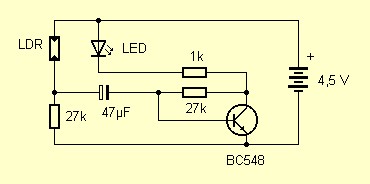 Die Schaltung ist nicht schwer zu verstehen. Immer wenn Licht auf den LDR fällt, steigt der Strom. Der Kondensator lädt sich auf und vergrößert den Basisstrom. Damit schaltet der Transistor die LED ganz ein. Der stabile AN-Zustand kippt in den AUS-Zustand, sobald der Kondensator völlig geladen ist. Die LED ist dann aus, die Basisspannung wird negativ, und der Transistor sperrt. Erst wenn der Kondensar durch den Basiswiderstand vollständig umgeladen ist, kann die Schaltung erneut in den AN-Zustand kippen.