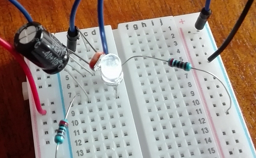 nachgebaut. Widerstände jeweils 2 k, U=3 V, Elko 100 µF, weiße
