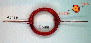 Der Anker ist eine Spule aus dickem Kupfer-Lack-Draht mit ungefähr zehn Windungen. Die Drahtenden sind zugleich die Achse. Mit kurzen Drahtstücken ist alles fest zusammengebunden. Und das Wichtigste: An beiden Enden ist der Lack nur auf einer Seite abgekratzt. Die blanke Stelle soll etwas schräg zur Spule liegen.