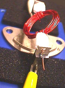 Als Lager dienen Leistungstransistoren, Spannungsregler oder Ähnliches. Der mittlere Anschluss ist meist mit dem Gehäuse verbunden und kann mit Krokodilklemmen an die Stromquelle gelegt werden. Im Versuch standen die Lager auf Moosgummi, Styropor geht auch. Wichtig ist, dass die Lager aus Metall sind, um den Strom zur Achse zu leiten. Und sie sollen größer sein als die Achse, damit sich alles schön locker drehen kann.