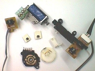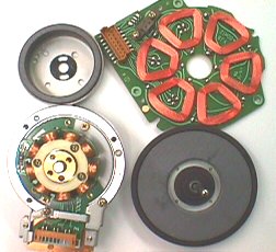 Zwei Motoren: Die Mehrpolmagnete werden über mehrere Spulen angetrieben. Damit es sich dreht, braucht man noch eine Menge Elektronik. Der größere Flachmotor ist ähnlich aufgebaut wie der in einem Diskettenlaufwerk: Achtung: Es wurden mindestens sechs astreine Hallelement-Sensoren gefunden. Damit kann man Magnetfeld-Messgeräte bauen!