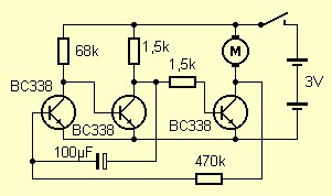 Eine Schaltung mit drei Transistoren dient als Zeitschalter. Der Motor