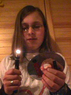 Hier sieht man das Licht einer Energiesparlampe. Ob die Ähnlichkeit zur UV-Lampe wohl ein Zufall ist? Nein, denn jede Leuchtstoffröhre enthält Quecksilberdampf. Die CD hat geholfen, die Energiesparlampe mit einer Spektralanalye zu überführen. Wegen des giftigen Quecksilbers sind solche Lampen auch Sondermüll. Also bitte nicht einfach in der Bastelbude zerklopfen!
