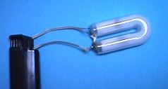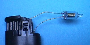 Ein Versuch mit einer durchgebrannten Taschenlampen-Halogenbirne: An der Unterbrechung des Glühfadens entsteht ein greller weißblauer Lichtbogen. Man kann es auch mit einer durchgebrannten 230-V-Lampe versuchen. Der hängende Glühfaden wird durch vorsichtiges Drehen der Lampe so justiert, dass sich eine enge Lücke zum anderen Ende ergibt. Man sieht dann einen blauen Miniblitz.