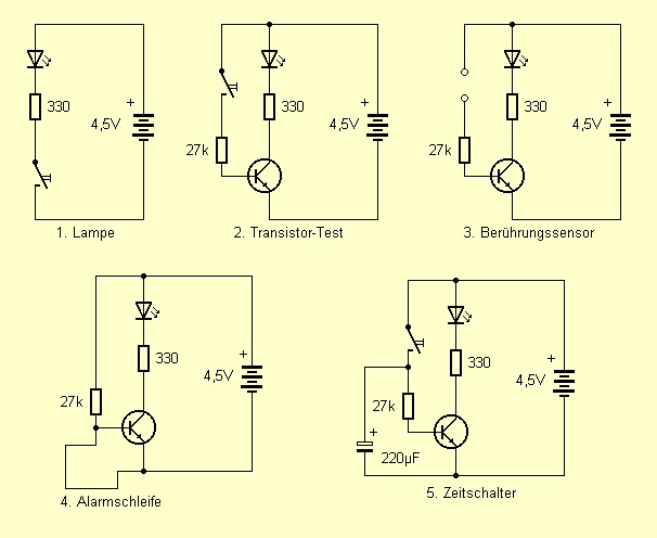 Der ganze Minikurs kann ganz ohne Theorie auskommen. Am besten baut man erst ein Muster und lässt die Kinder oder Jugendlichen dann alles Schritt für Schritt nachbauen. Wenn es aber jemand interessiert, hier sind die Schaltungen aller fünf Versuche. Die Widerstandswerte sind nur Vorschläge. Man nimmt einfach ähnliche, die gerade da sind.