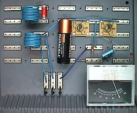Der Versuch wurde mit einem Kosmos-Baukasten ausprobiert. Man beachte: Der obere Schwingkreis mit einem Festkondensator hat keine leitende Verbindung mit der übrigen Schaltung. Er ist aber magnetisch mit dem unteren, Drehko-abstimmbaren Schwingkreis gekoppelt, so dass er bei gleicher Frequenz zu Schwingungen angeregt wird. Das sieht man an einem Ausschlag des Messgeräts.