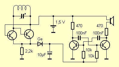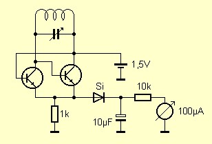 Natürlich wurden Dipmeter auch mit Transistoren gebaut. Heute sind sie etwas aus der Mode gekommen. Nur die Funkamateure wissen noch damit umzugehen. Dabei ist der Bau sehr einfach. Damit man mit einer kleinen Spannung von nur 1,5 V auskommt, kann eine Schaltung mit zwei Transistoren genommen werden. Sie hat auch den Vorteil, dass die Spule keine Anzapfung braucht. Man kann also leicht viele unterschiedliche Spulen für alle möglichen Frequenzbereiche anschließen.
