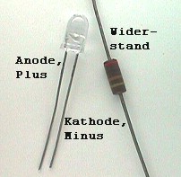 Die Leuchtdiode lässt einen Strom nur in einer Richtung fließen. Es gibt einen Minusanschluss (Kathode, kurzer Draht) und einen Plusanschluss (Anode, langer Draht). Die Kathode ist in den meisten Fällen der Anschluss mit dem größeren Metallhalter in der LED, auf dem der LED-Kristall sitzt.