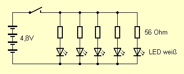 Hier kommt ein ganz praktisches Beispiel: Es sollen fünf weiße LEDs in eine Höhlenlampe eingebaut werden. Der Conrad-Katalog bietet LEDs mit Uf = 3,6 V und If = 20 mA an. Es bringt übrigens nicht viel, die LEDs bei größerem Strom zu betreiben. Doppelter Strom führt nicht mehr zu doppelter Helligkeit. Also soll im Normalfall 20 mA durch jede Diode fließen. Die Akkuspannung muss etwas größer sein, also nimmt man vier NiCd-Zellen mit 4,8 V. Es ist nicht günstig, einen gemeinsamen Vorwiderstand für alle LEDs zu nehmen, weil geringfügige Unterschiede zwischen den einzelnen LEDs zu einer ungleichen Stromverteilung führen würden. Also soll jede LED ihren eigenen Vorwiderstand bekommen. Der Spannungsabfall beträgt jeweils 4,8 V - 3,6 V = 1,2 V. Der Widerstand soll sein: 1,2 V / 0,02 A = 60 Ohm. Man wählt den Normwiderstand 56 Ohm (Farben: grün, blau, schwarz).