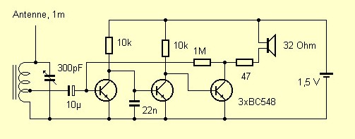 Kann man einfache Transistorradios noch besser bauen? Ich wurde nach einer Schaltung gefragt, die möglichst einfach und effektiv ist. Deshalb wollte ich ein kleines Radio für Kopfhörerbetrieb und mit einer Betriebsspannung von nur 1,5 V bauen. Die Schaltung sollte allein duch Anschluss eines anderen Schwingkreises universell für alle Frequenzbereiche bis ca. 30 MHz einsetzbar sein.