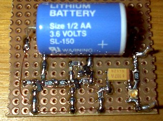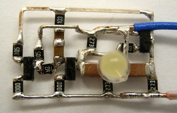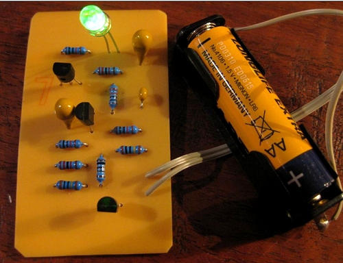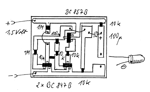 "Die Schaltung ist sehr schön und einfach, da keine unbekannten Spulen aus der Bastelkiste durchprobiert werden müssen - es hat auf Anhieb funktioniert! Ich habe diesen Blinker in SMD nachgebaut und bin mit einer relativ kleinen Grundfälche ausgekommen."