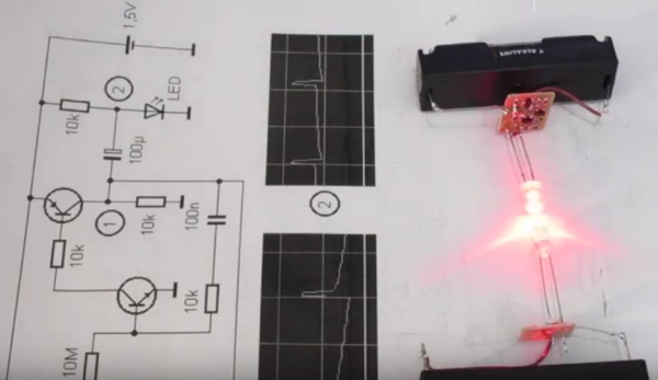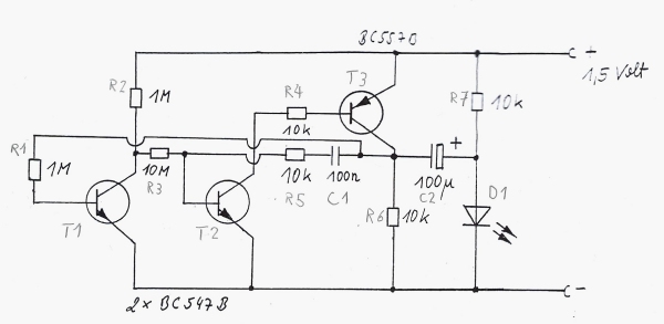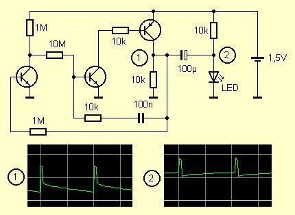 Hier ist die Schaltung. Sie besteht aus einem astabilen Multivibrator mit besonderen Eigenschaften. Ein Elko von 100 µF lädt sich relativ langsam und mit kleinem Strom auf und wird in einem kurzen Impuls über die LED entladen. Dabei kommt es auch zur nötigen Spannungsüberhöhung, denn 1,5 V ist ja für eine LED zu wenig.