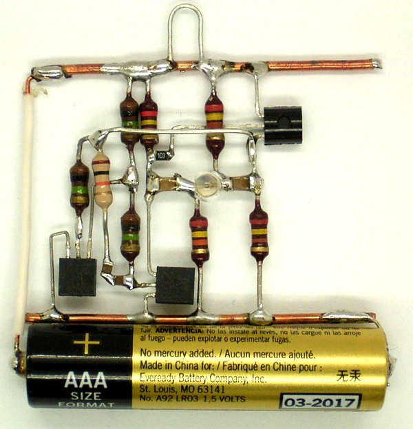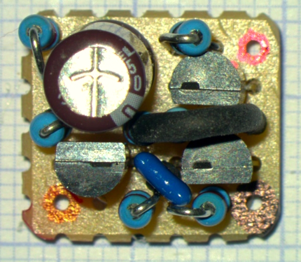 Martin Gerdes schreibt dazu: Der Charme liegt darin, dass ich statt Elkos MLCCs verwende, die es mittlerweile ja mit erheblicher Kapazität gibt, die man den Dingern nicht ansieht. Wer das Bauteil nicht kennt, fragt sich, wo wohl der nötige Kondensator verbaut ist. Für das Zeitglied habe ich zwei 1-µF-MLCCs genommen. Mit herkömmlichen Bauteilen ist der Blinker einfach ein Hingucker. An dem kleinen Henkel kann man sich so einen Blinker an den Hemdenknopf hängen, er beeindruckt die Leute immer noch. Meiner Frau gefallen die Dinger (erfreulicherweise; sonst hat sie mit Elektronik nichts am Hut), also hängen bei uns in der Wohnung etliche herum.