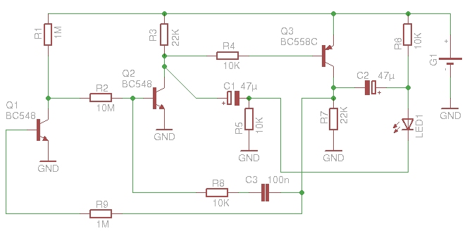 Die Schaltung wurde für den Lowpower-Betrieb optimiert. Deshalb hat der eigentliche Flip-Flop einen NPN- und einen PNP-Transistor bekommen. Man kann auf diese Weise die Verschwendung von Steuerstrom vermeiden. Beide Transistoren leiten nur für den kurzen Moment des LED-Blinkens. Damit stabile Bedingungen herrschen und die Schaltung sicher schwingt, gibt es eine zusätzliche Stufe mit einer Gleichspannungs-Gegenkopplung. Auch hier wurde durch besonders hochohmige Widerstände auf geringsten Verbrauch geachtet.