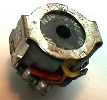 Zum Glück hat ein gewisser Herr Thomson die Schwingkreisformel gefunden. Mit dem Oszilloskop kann die Schwingfrequenz mit 5 kHz bestimmt werden. Der Kondensator hat 330 nF. Damit ergibt sich Induktivität von 3 mH. Und auf dem Schalenkern steht der Typ mit dem Ferritwerkstoff N30 und dem Al-Wert von 4200 nH/n². Demnach muss die Primärwicklung insgesamt 26 Windungen haben, d.h. jede Seite hat 13 Windungen. Mit dem Oszilloskop kann jeweils zwischen Mittelanzapfung und Außenanschluss im Leerlauf primär eine Scheitelspannung von 1,5 V gemessen werden und sekundär 30 V. Daraus ergibt sich das Übertragungsverhältnis 1 : 20. Die Sekundärwicklung hat also 2 mal 260 Windungen. Wie dick der Draht ist, weiß ich leider nicht genau, denn er ist an den Anschlüssen mit Isolierschläuchen überzogen. Jedenfalls ziemlich dünn.