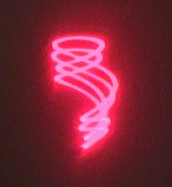 Der Laserpointer wird auf den Ablenkspiegel gerichtet. Die beiden Spulen schließt man an geeignete Signalquellen an. Im ersten Versuch wurde eine Spule über einen Vorwiderstand an einen Netztrafo gelegt, der Ablenkstrom betrug etwa 50 mA. Die andere Spule war an einen Sinus-Signalgenerator angeschlossen.