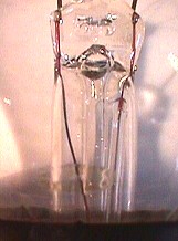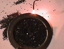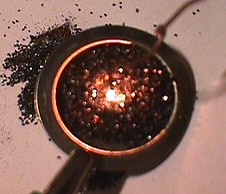 Die ersten Versuche mit groben Körnchen wurden mit einer Spannung 40 V ausgeführt. Man kann ab und zu ein Körnchen treffen, das genügend leitet, um heiß zu werden. Dann zerspringt es meist und fliegt glühend durch die Gegend. Aber mit Hochspannung geht es besser. Mit einem Kupferdraht stellt man die Verbindung her. Oft findet man mehrere leuchtende Körnchen gleichzeitig. Wird ein Korn voll von einem Lichtbogen getroffen, kann es extrem hell leuchten.
