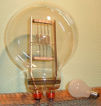 Die andere Lampe ist eine alte 60-Watt-Glühlampe. Sie war Jahrzehnte lang in einer Treppenhausbeleuchtung im Einsatz. Man beachte die Zickzack-Führung des Glühfadens.