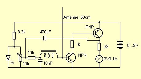 Der Schaltplan zeigt eine monostabile Kippschaltung. Über das Poti kann die Vorspannung so eingestellt werden, dass sie gerade noch nicht kippt. Die Antenne an der Basis des ersten Transistors empfängt einen HF-Impuls, der das Flipflop triggert. Nun leuchtet die Lampe für eine Sekunde und geht dann wieder aus. Danach braucht die Schaltung ein paar Sekunden, um wieder empfangsbereit zu werden.
