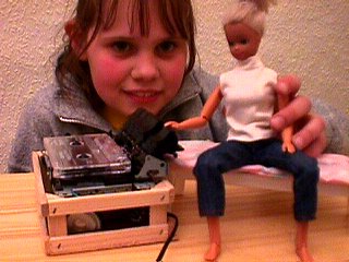 Auch Barbie möchte Musik hören. Deshalb hat Luci sich ein Kassettendeck mit Verstärker und Lautsprecher gebaut. Das Kassettenlaufwerk stammt aus einer defekten Kompaktanlage, die nach der bewährten ER-20-Z-Methode behandelt wurde: (E)rfolglose (R)eparaturversuche genau (20) Minuten lang, danach sofortiges und unumkehrbares (Z)erlegen. Das Schöne an dem Laufwerk ist, dass es sehr übersichtliche Anschlüsse hat: Motor, Schalter, Tonkopf. Da fehlte nur noch ein Verstärker.