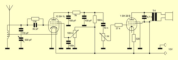 Die russische Röhre 12SH1L hat es mir angetan. Heizung nur 12V/75mA, dazu tauglich für kleine Anodenspannung. Es ist eine indirekt beheizte Pentode, geradezu ideal für ein Audion mit einstellbarer Rückkopplung. Die Röhre befindet sich normalerweise in einer Metallabschirmung, die allerdings aus Gründen der Optik entfernt wurde. Röhren müssen aus Glas sein!