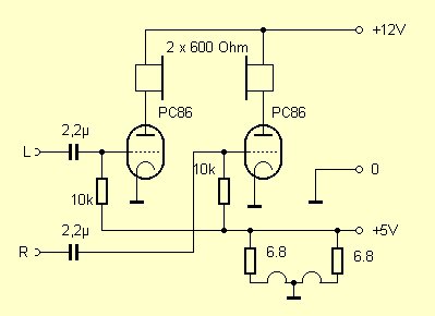 Die Heizspannung wird hier mit Vorwiderständen auf ca. 3,8 V gebracht.Der bescheidene Heizstrom von insgesamt 600 mA kann locker von einem PC-Netzteil nebenbei aufgebracht werden. Deshalb könnte das der ideale Kopfhörerverstärker für die PC-Soundkarte sein. Auch der direkte Einbau in den PC ist nicht unmöglich.