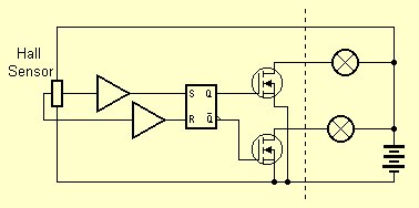Die Versuche mit diesem Baustein legen folgendes Innenschaltbild nahe. Ein Hallsensor liefert ein Signal, wenn ein äußeres Magnetfeld herrscht. Ab einer gewisse Stärke wird ein RS-Flipflop getriggert und schaltet die Ausgänge um. Der bürstenlose Lüftermotor funktioniert also deshalb, weil das IC immer weiß, in welcher Stellung der Anker steht. Es wird dann jeweils die passende Spule eingeschaltet.