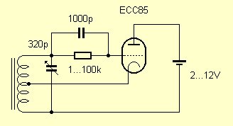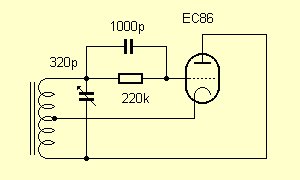 Die Schaltung ist das Endergebnis einer Versuchsreihe zum Thema "Wie viel Anodenspannung braucht die Röhre". Sobald echte Verstärkung auftritt, kann man Schwingungen erzeugen. Für den Versuch wurde eine möglichst verlustarme Anordnung gewählt. Eine Mittelwellen-Ferritantenne mit einer Wicklung aus HF-Litze zusammen mit einem Folien-Drehkondensator weist einen hohen Resonanzwiderstand auf. Allerdings bewirkt der unvermeidliche Gitterstrom der Röhre eine zusätzliche Dämpfung. Es ist daher nötig, den Gitterwiderstand zu variieren. Ein großer Gitterwiderstand verringert den Gitterstrom und die Dämpfung, zugleich aber auch den Anodenstrom und die Steilheit der Röhre. Der optimale Kompromiss kann für jede Röhre anders aussehen. Für eine ECC85 lag das beste Ergebnis bei 5,6 kOhm und 2,5 V. Mit der PC86 ergab sich eine Überraschung: Das Optimum lag bei größeren Widerständen von einigen 100 kOhm. Bei einer Anodenspannung von nur einem Volt konnten noch Pendelschwingungen beobachtet werden. Und bis herunter zu null Volt reißt die Schwingung nicht ab.