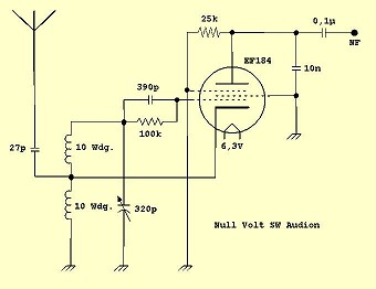 Michael Huber berichtet: Der Radiomann zu Weihnachten hats vorgemacht, frisch in die Röhrenkiste gegriffen! Ich habe mich dann an einem Pentodenaudion mit EF184 versucht (die war grad da), heizen und 30 Volt aus dem Labornetzteil als Anodenspannung, und schon gehts. Beim Testen, wie weit die Anodenspannung sinken darf, stelle ich fest, dass bis 0 Volt runter noch Musik aus dem Lautsprecher tönt! Dem muss nachgegangen werden. Netzteil abgeklemmt und Plus des Versuchsaufbaus mit Masse verbunden, immer noch Musik, das Radio ist auch noch einwandfrei abstimmbar. Jetzt aber: Alles überflüssige weg (z.B. Rückkoppelungspoti am Schirmgitter), immer noch Musik! Still wirds erst, wenn die Heizung abgeschalten wird. (Ich finde das sehr beruhigend, anderenfalls müsste man die Quelle der Töne wo anders suchen als in der Röhre).