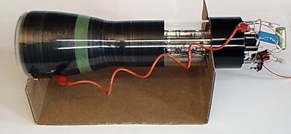Der Ablenkoszillator zeigt seine Tätigkeit durch ein schwaches Flackern der Glimmlampe. Immer wenn der parallele Kondensator sich bis auf die Zündspannung aufgeladen hat, wird er mit einem kurzen Stromstoß entladen. Man erhält so ganz einfach die erforderliche Sägezahnspannung für die X-Ablenkung. Die Betriebsspannung wurde übrigens vom Spannungswandler für das Magische Auge entliehen. 300 V ist nicht viel, sodass man keine große Helligkeit erwarten kann. Ein paar Volt mehr an der Anode wirken hier Wunder, denn original wurden ca. 2 kV verwendet. Der Stahl lässt sich jedoch schon bei einer Betriebsspannung von nur 300 V gut fokussieren.
