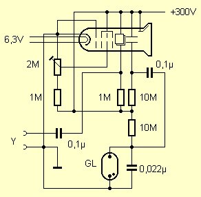 Wenn bekant ist, wo Heizung, Kathode, alle Gitter, die Ablenkplatten und die Anode angeschlossen sind, kann man sich ein Oszilloskop bauen. Die einfachste Schaltung sieht man hier. Y-Eingang über einen Kondensator an einer der beiden Y-Platten, X-Ablenkung mit Glimmröhren-Kippschaltung, Fokusregler, fertig ist der Oszillograph. So ähnlich wird es Herr Braun auch gemacht haben.