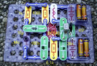 Da muss ich auch erst genauer hinschauen, was der Felix da geknöpft hat. Doch, es ist ein Parallelschwingkreis, weil die Batterie für HF eine Verbindung darstellt. Drehko und 20-nF-Kondensator liegen in Reihe. Der kapazitive Spannungsteiler hat einen Punkt mit kleinem Innenwiderstand am Emitter. Der Transistor arbeitet in Basisschaltung, also mit dem Eingang am Emitter und Ausgang am Kollektor. Die Schaltung ist so ähnlich wie beim KW-Pendelaudion oder beim UKW-Oszillator am PC. Hier bildet der Drehko zugleich den Rückkopplungskondensator. Das ging wohl nicht anders, weil der Baukasten nur 20 nF und 100 nF verwendet. Mit z.B. 200 pF zu 20000 pF teilt man die Spannung 100 zu 1, das geht gerade noch, weil der Transistor eine Spannungsverstärkung über 100 hat. So, jetzt geht mir auch ein Licht auf, warum der Sender irgendwo unter 700 kHz eingestellt wurde. Darüber wird nämlich das Kapazitätsverhältnis zu ungünstig.