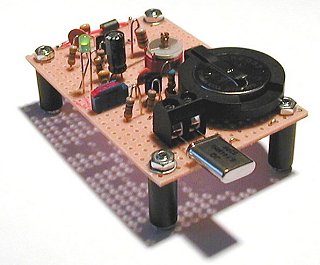 Michael Stutzbach berichtet: Habe das Gerät in der Trimmerversion jetzt nachgebaut (siehe Foto). Da der Stromverbrauch nur bei ca. 2,5 mA liegt, wurde die Stromversorgung in Form einer 3V-Knopfzelle gleich mit aufgelötet. Damit der Oszillator sicher schwingt musste ich den Rückkopplungskondensator auf 33pF vergrößern (nur bei 4 MHz, bei 6,144 MHz ging es auch mit 22pF).