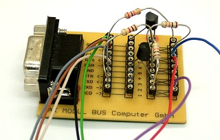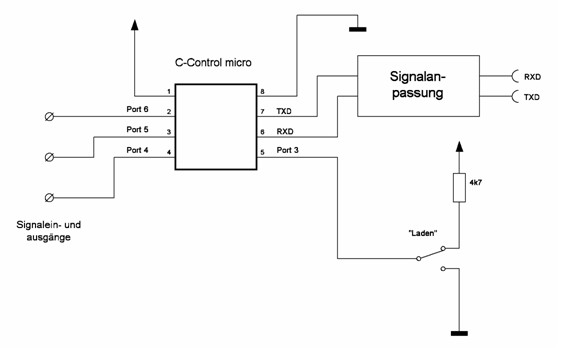 Für die Micro-Unit gibt es ein eigenes Programmier- und Experimentierboard mit Software-CD und Bedienungsanleitung. Mein Ehrgeiz lag aber darin, ohne dieses Board auszukommen. Im Internet findet man unter www.c-control-support.de alles nötige an Software und Informationen. Der Programmieradaper benötigt eigentlich nicht mehr als die Inverter/Pegelwandler für die RS232. Diese wurden in fast gleicher Schaltung wie auf dem Programmierboard auf einer ELEXS-Platine aufgebaut.